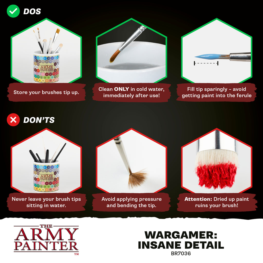 Designed with an ultra-fine tip for pinpoint accuracy, the Size 5/0mm Insane Detail brush, with Bionic Bristles, is ideal for precision work such as weapons, monster scales, and rivets.